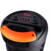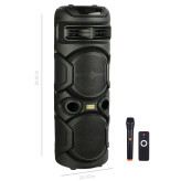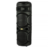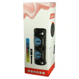 اسپیکر چمدانی بلوتوثی گلکس بیت GS40 + میکروفون و ریموت کنترل اسپیکر چمدانی بی سیم قابل حمل Galexbit مدل GS40 همراه با میکروفون و ریموت کنترل برخوردار از 2 عدد درایو 8 اینچی با توان خروجی کلی 40 وات (2×20W)، اتصال بی سیم از طریق بلوتوث و با سیم توسط رابط جک 3.5 میلی متری صدا مجهز به هولدر میکروفون و استند موبایل، دارای یک عدد ورودی میکروفون، اقلام همراه محصول شامل یک عدد میکروفون، ریموت کنترل و آداپتور پخش فایل های ذخیره شده با پشتیبانی از فلش مموری USB و کارت حافظه میکرو اس دی، دارای دسته و چرخ به منظور سهولت در حمل ساخته شده از جنس پلاستیک و فلز مقاوم در برابر ضربه و فشار، دارای کلید های فیزیکی به منظور مدیریت موسیقی، تنظیم ولوم و ... مجهز به نورپردازی LED جهت ایجاد جلوه بصری زیبا در محیط کم نور و تاریک، برخوردار از نمایشگر LED جهت اطلاع از کارکرد تامین انرژی توسط باتری داخلی با قابلیت شارژ از طریق پورت سوزنی تعبیه شده بر روی بدنه و آداپتور همراه پشتیبانی از فناوری TWS به منظور اتصال همزمان به دو یا چند دستگاه از یک منبع بلوتوثی واحد