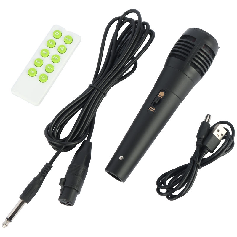 اقلام همراه شامل میکروفون، ریموت کنترل، سیم میکروفون و کابل شارژ