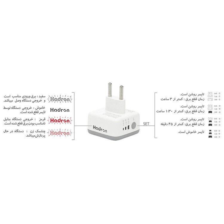همانگونه که در ابتدا ذکر شد این محصول یک تبدیل 3 به 2 بوده و در واقع پریز آن از نوع یونیورسال می باشد تا بتوانید دستگاه هایی که دارای این نوع از فیش هستند را به پریز برق های ایرانی متصل کنید. این محصول علاوه بر مبدل برق بودن و داشتن تایمر، قابلیت محافظت از دستگاه متصل در برابر نوسانات برق را نیز دارد و بر روی بدنه آن دقیقا در زیر عبارت Hadron نشانگری تعبیه شده تا از وضعیت برق و کارکرد محصول آگاه شوید.