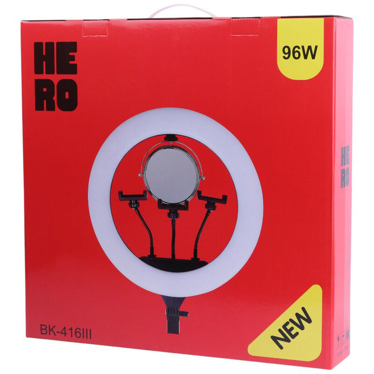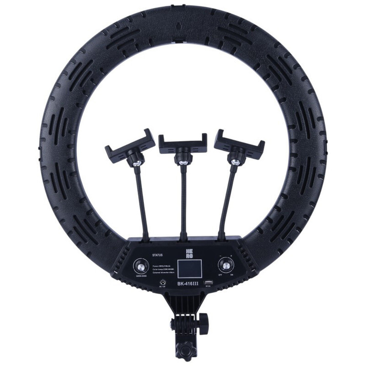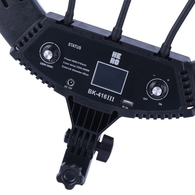 حلقه با قطر 18 اینچ با 416 عدد LED و توان خروجی 96 وات، دمای رنگ متغیر بین 3200 الی 5500 کلوین