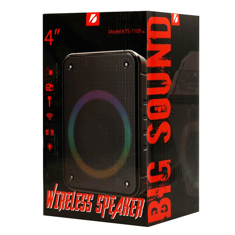 اسپیکر KTS-1109 از محصولات خوش ساخت و دارای بدنه ای مقاوم می باشد که از قدرت صدای خوبی برخوردار است. این دستگاه پخش کننده صوتی توسط بلوتوث به طور بی سیم به گوشی موبایل، تبلت، لپ تاپ و ... تا شعاع ۱۰ متری بدون هیچ قطعی متصل می شود. همچنین روش های اتصال دیگری نظیر رابط جک صوتی ۳٫۵ میلی متری، پورت فلش مموری USB، شیار کارت حافظه رم میکرو SD و درگاه AUX نیز فراهم شده تا کاربر به دیگر فایل های صوتی خود دسترسی های بیشتر و راحت تری داشته باشد. نورپردازی RGB داخلی نیز برای این اسپیکر درنظر گرفته شده که جذابیت و زیبایی آن در هنگام پخش موسیقی را دو چندان خواهد کرد. یک سری دکمه فیزیکی در قسمت بالای پنل این دستگاه تعبیه شده تا به آسانی بتوانید میزان حجم صدا، پخش موسیقی، Mode، نورپردازی و ... را مدیریت نمایید. اسپیکر بی سیم قابل حمل مدل KTS1109 با ساب ووفر به قطر درایو ۴ اینچی و توان خروجی ۱۰ وات می تواند صدایی قدرتمند با وضوح فراگیر و رسا را به گوش برساند. این دستگاه با پشتیبانی از محدوده فرکانسی ۱۰۰ هرتز تا ۲۰ کیلو هرتز، حساسیت سیگنال به نویز ۸۵ دسی بل قادر است طیف وسیعی از صداهای زیر و بم موسیقی را با بیس بالا و شفاف حتی در محیط های شلوغ پخش کند. یکی از ویژگی های کاربردی و خوب این اسپیکر مجهز بودن به ورودی میکروفون می باشد که علاوه بر ضبط صدا امکان استفاده در سخنرانی ها، مصاحبه ها، همخوانی با آهنگ، تمرین خوانندگی و ... را در اختیار کاربر قرار می دهد. قابلیت رادیو FM هم برای این دستگاه فراهم شده که بهترین کیفیت کانال ها را دریافت می کند تا برنامه های رادیویی را با بهترین قدرت صدایی و بدون نویز بشنوید. باتری داخلی لیتیومی با ظرفیت ۱۲۰۰ میلی آمپرساعت برای اسپیکر بلوتوثی رم و فلش خور KTS-1109 درنظر گرفته شده که توانایی پخش مداوم موسیقی تا حداکثر ۲ ساعت را با بلندی صدای ۷۵ درصد خواهد داشت، همچنین از طریق پورت تایپ سی که بر روی بدنه آن تعبیه شده امکان شارژ کامل باتری این دستگاه وجود دارد که ۳ ساعت طول می کشد.