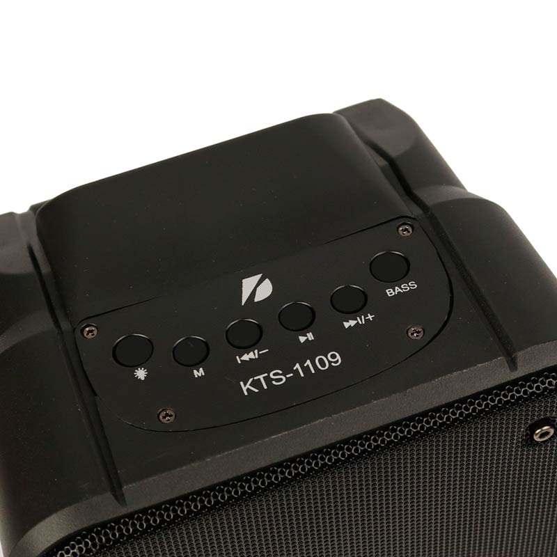 اسپیکر KTS-1109 از محصولات خوش ساخت و دارای بدنه ای مقاوم می باشد که از قدرت صدای خوبی برخوردار است. این دستگاه پخش کننده صوتی توسط بلوتوث به طور بی سیم به گوشی موبایل، تبلت، لپ تاپ و ... تا شعاع ۱۰ متری بدون هیچ قطعی متصل می شود. همچنین روش های اتصال دیگری نظیر رابط جک صوتی ۳٫۵ میلی متری، پورت فلش مموری USB، شیار کارت حافظه رم میکرو SD و درگاه AUX نیز فراهم شده تا کاربر به دیگر فایل های صوتی خود دسترسی های بیشتر و راحت تری داشته باشد. نورپردازی RGB داخلی نیز برای این اسپیکر درنظر گرفته شده که جذابیت و زیبایی آن در هنگام پخش موسیقی را دو چندان خواهد کرد. یک سری دکمه فیزیکی در قسمت بالای پنل این دستگاه تعبیه شده تا به آسانی بتوانید میزان حجم صدا، پخش موسیقی، Mode، نورپردازی و ... را مدیریت نمایید. اسپیکر بی سیم قابل حمل مدل KTS1109 با ساب ووفر به قطر درایو ۴ اینچی و توان خروجی ۱۰ وات می تواند صدایی قدرتمند با وضوح فراگیر و رسا را به گوش برساند. این دستگاه با پشتیبانی از محدوده فرکانسی ۱۰۰ هرتز تا ۲۰ کیلو هرتز، حساسیت سیگنال به نویز ۸۵ دسی بل قادر است طیف وسیعی از صداهای زیر و بم موسیقی را با بیس بالا و شفاف حتی در محیط های شلوغ پخش کند. یکی از ویژگی های کاربردی و خوب این اسپیکر مجهز بودن به ورودی میکروفون می باشد که علاوه بر ضبط صدا امکان استفاده در سخنرانی ها، مصاحبه ها، همخوانی با آهنگ، تمرین خوانندگی و ... را در اختیار کاربر قرار می دهد. قابلیت رادیو FM هم برای این دستگاه فراهم شده که بهترین کیفیت کانال ها را دریافت می کند تا برنامه های رادیویی را با بهترین قدرت صدایی و بدون نویز بشنوید. باتری داخلی لیتیومی با ظرفیت ۱۲۰۰ میلی آمپرساعت برای اسپیکر بلوتوثی رم و فلش خور KTS-1109 درنظر گرفته شده که توانایی پخش مداوم موسیقی تا حداکثر ۲ ساعت را با بلندی صدای ۷۵ درصد خواهد داشت، همچنین از طریق پورت تایپ سی که بر روی بدنه آن تعبیه شده امکان شارژ کامل باتری این دستگاه وجود دارد که ۳ ساعت طول می کشد.